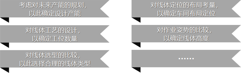 在線體規(guī)劃設(shè)計(jì)項(xiàng)目中,我們會(huì)充分考慮對(duì)未來(lái)產(chǎn)能的規(guī)劃,以此確定設(shè)計(jì)產(chǎn)能;對(duì)線體工藝的設(shè)計(jì),以確定工位數(shù)量;對(duì)線體選型的比較,以此選擇合理的線體類型;對(duì)線體定位的布局考量,以確定車間布局定位;對(duì)作業(yè)姿勢(shì)的比較,以確定線體高度;對(duì)尺寸骨架的設(shè)計(jì),以確定主體尺寸;對(duì)工裝吊架設(shè)計(jì)的考慮,以確定吊架方式選擇;對(duì)工位詳細(xì)布局,通過(guò)工藝模擬驗(yàn)證;對(duì)輔助設(shè)施設(shè)置的考慮,以滿足特殊需求;對(duì)外部接口的考慮,以提前預(yù)留對(duì)外施工接口。以實(shí)現(xiàn)線體規(guī)劃的有效性及合理性。