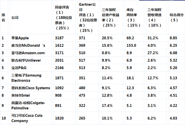 首先我們看一下2014年全球供應(yīng)鏈運(yùn)營(yíng)管理的公司有哪些,排在前頭的是蘋(píng)果,綜合評(píng)分8.85,第二位麥當(dāng)勞公司。