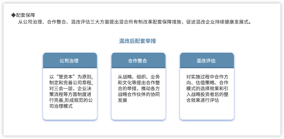 黨的十九大報告指出:“要深化國有企業(yè)改革,發(fā)展混合所有制經(jīng)濟(jì),培育具有全球競爭力的世界一流企業(yè)”;當(dāng)前,隨著國企改革“雙百行動”、區(qū)域性國資國企綜合改革試驗(yàn)、“科改示范行動”、第三批以及第四批混改試點(diǎn)的實(shí)施,國企改革由點(diǎn)向面梯次鋪開、范圍逐步擴(kuò)大,并呈現(xiàn)明顯加速,國有企業(yè)改革進(jìn)入“深水區(qū)”。追本溯源,國企改革到底怎么改,回到國有企業(yè)改革的初衷我們認(rèn)為,國有企業(yè)改革是以混和所有制為手段,在堅持黨的領(lǐng)導(dǎo)下建立現(xiàn)代企業(yè)制度,優(yōu)化管理關(guān)系,創(chuàng)新管理機(jī)制,激發(fā)員工活力,從而最終實(shí)現(xiàn)國有企業(yè)的持續(xù)發(fā)展?;旄穆鋵?shí)到具體實(shí)踐中,便處處是難點(diǎn)。遠(yuǎn)大方略認(rèn)為,混改的重點(diǎn)已經(jīng)從以“政策研究+方案制定”為主轉(zhuǎn)變到以化解落地過程中的實(shí)際痛點(diǎn)為主,從剖析“為什么混、和誰混、怎么混”轉(zhuǎn)變?yōu)槁鋵?shí)治理結(jié)構(gòu)、戰(zhàn)略協(xié)同以及激勵機(jī)制等深層次問題。