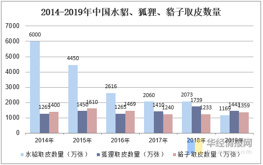 通常應(yīng)用的毛皮有羊、兔、狗等,比較名貴的有狐貍、貉子、水貂毛皮等,常用做大衣、帽子、圍巾的材料,比較厚重的毛皮如熊、狼的毛皮一般作為褥子、掛毯等材料。2019年中國水貂、狐貍、貉子取皮數(shù)量分別為1169萬張、1443萬張、1359萬張。