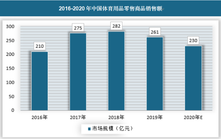 隨著政策利好、人民體育消費(fèi)需求的提高,我國體育用品行業(yè)的發(fā)展將進(jìn)入新時(shí)期。體育品牌分別針對消費(fèi)者的不同需求類型,拓展專項(xiàng)的運(yùn)動用品市場,例如兒童、女性運(yùn)動用品等。而跑步作為一項(xiàng)大眾體育運(yùn)動,近幾年跑步類產(chǎn)品更是需求增長迅猛。2016-2018年中國體育用品零售商品銷售額逐年增加,2019年中國體育用品零售商品銷售額達(dá)到261億元。新冠肺炎疫情對我國體育用品行業(yè)造成一定的影響,人們參與相關(guān)戶外體育活動的大幅降低。預(yù)計(jì)2020年中國體育用品零售商品銷售額將達(dá)到230億元左右,具體如下: