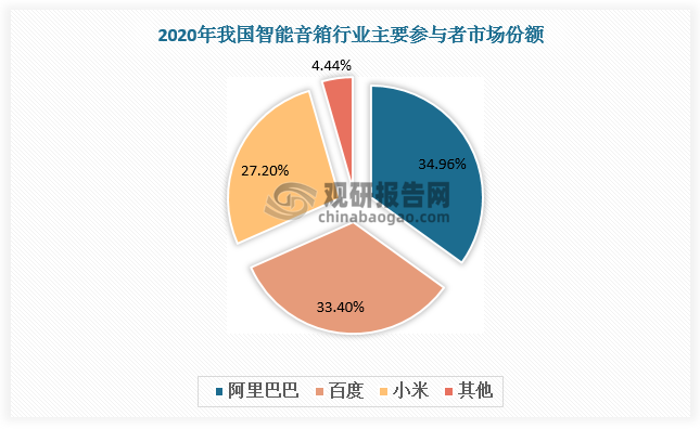從市場(chǎng)集中度來看,我國(guó)智能音箱行業(yè)集中度高,且呈現(xiàn)不斷加強(qiáng)趨勢(shì)。數(shù)據(jù)顯示,2019-2020年我國(guó)智能音箱市場(chǎng)CR3由92.7%上升至95.6%。從競(jìng)爭(zhēng)格局看,智能音箱市場(chǎng)呈現(xiàn)阿里巴巴、百度、小米三足鼎立市場(chǎng)格局,2020年市場(chǎng)份額分別為34.96%、33.4%、27.2%。