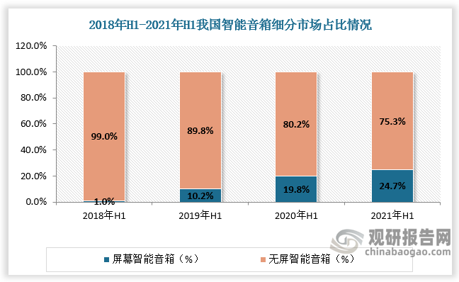 從細(xì)分市場(chǎng)看,智能音箱分為屏幕音箱和無屏音箱,近年來隨著智能音箱技術(shù)水平提升,產(chǎn)品智能程度提高,屏幕音箱占比逐漸提升,2021年H1達(dá)24.7%,較2018年H1增長(zhǎng)23.7個(gè)百分點(diǎn)。